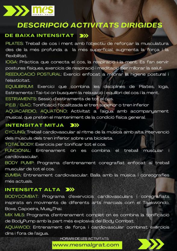 L'equip MES ha preparat un conjunt d'activitats per a tots aquells que busquen gaudir de la pràctica de l'esport i millorar la qualitat de vida. En un ambient agradable i amb el millor equipament, podràs practicar tot un seguit d'activitats físiques i de salut.